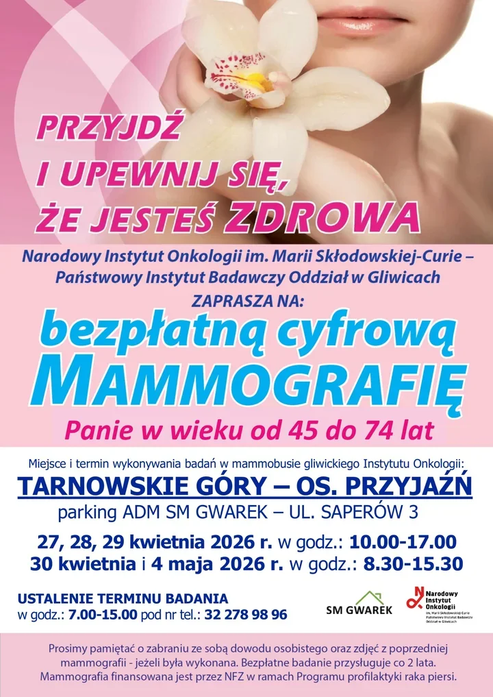 W Tarnowskich Górach pojawi się mobilny punkt badań, a dla wielu mieszkanek to szansa, by bez długiego czekania sprawdzić swój stan zdrowia. Narodowy Instytut Onkologii w Gliwicach uruchamia bezpłatną cyfrową mammografię i przyjmie panie urodzone w latach 1952–1981. Badania będą prowadzone w kilku terminach na Osiedlu Przyjaźń.