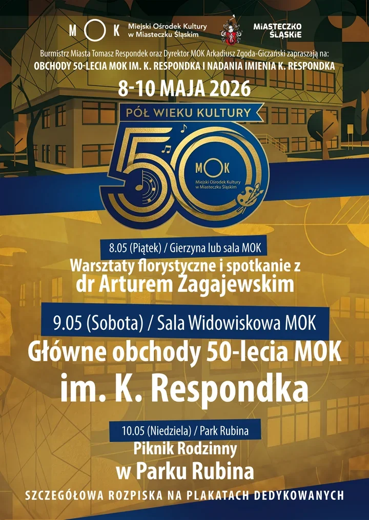 W Miasteczku Śląskim jubileusz Miejskiego Ośrodka Kultury rozpisano na cały wiosenno–letni kalendarz, a nie na jedną uroczystość. Najpierw pojawią się warsztaty i spotkania, potem gala, a później rodzinny piknik, koncerty i miejskie świętowanie. Program ma łączyć scenę, plener i kameralne rozmowy, więc każdy znajdzie w nim coś dla siebie. To świętowanie pokazuje, że pół wieku działalności MOK-u ma wybrzmieć głośno i różnorodnie.